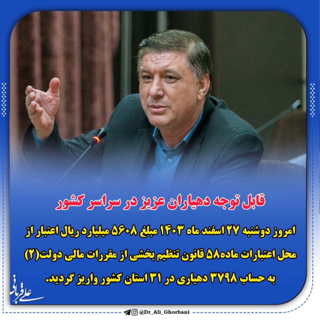 قابل توجه دهیاران عزیز در سراسر کشور امروز دوشنبه ۲۷ اسفند ماه ۱۴۰۳ مبلغ ۵۶۰۸ میلیارد ریال اعتبار از محل اعتبارات ماده۵۸ قانون تنظیم بخشی